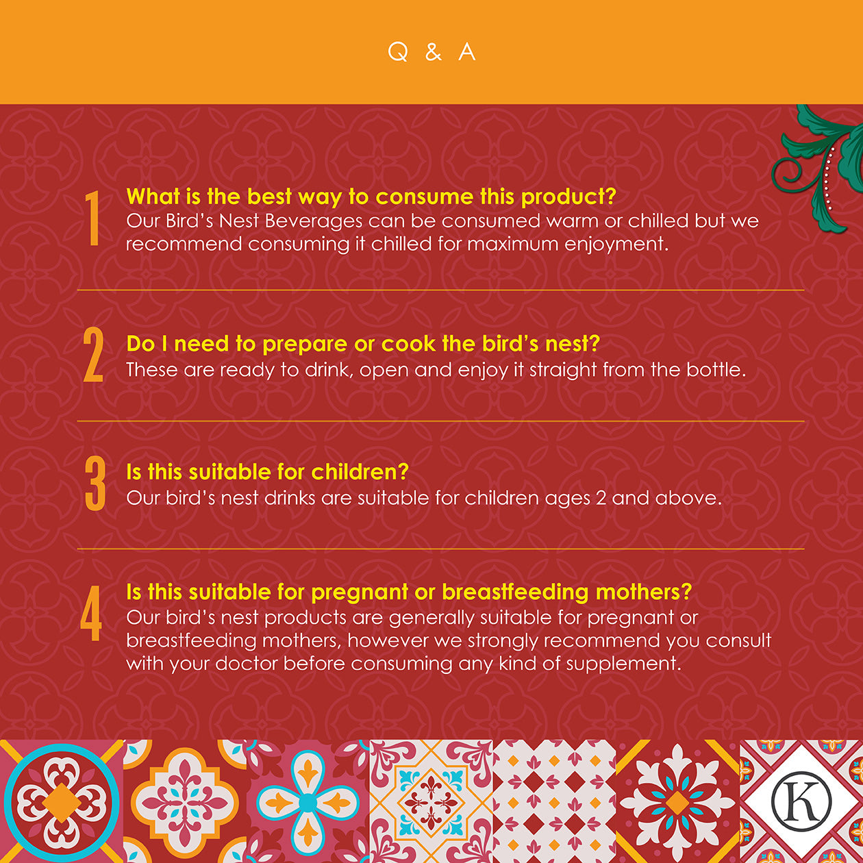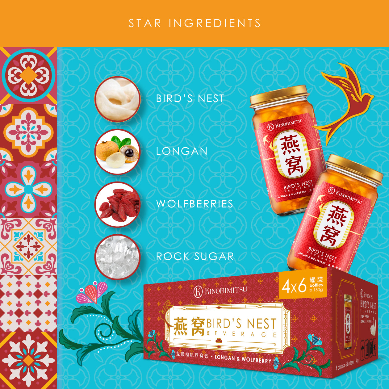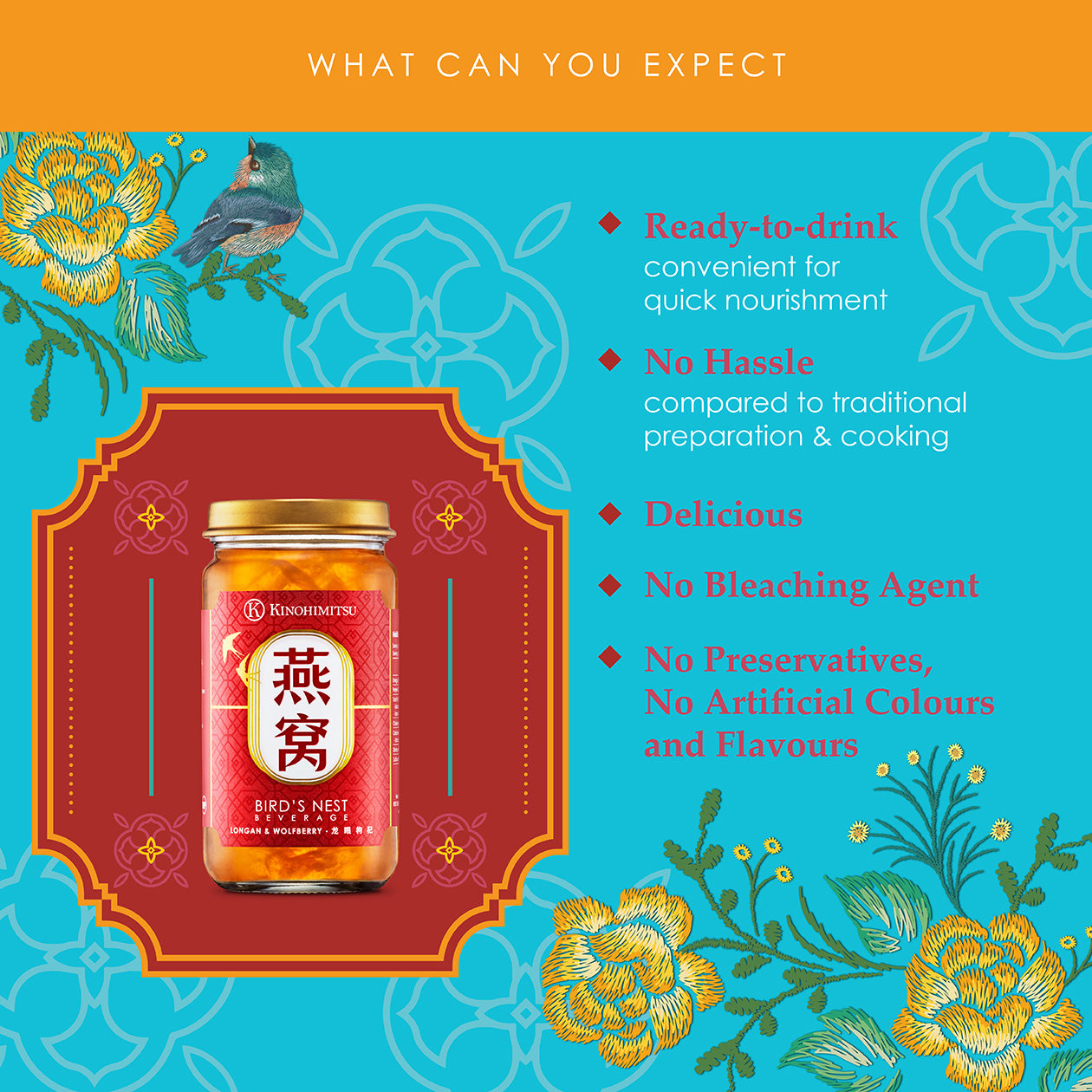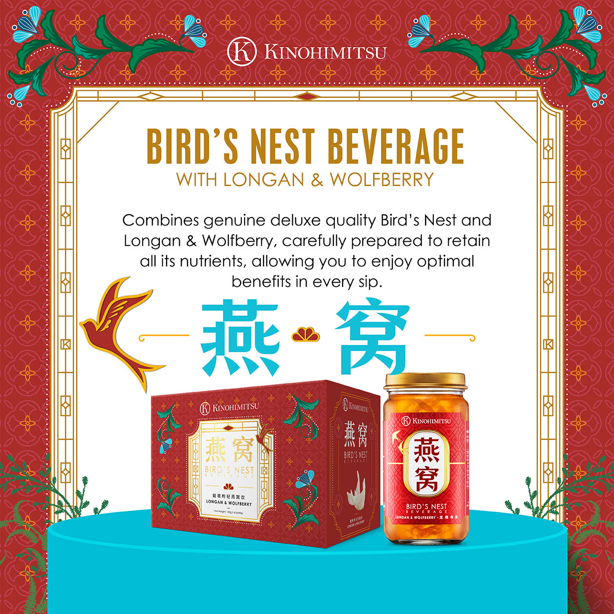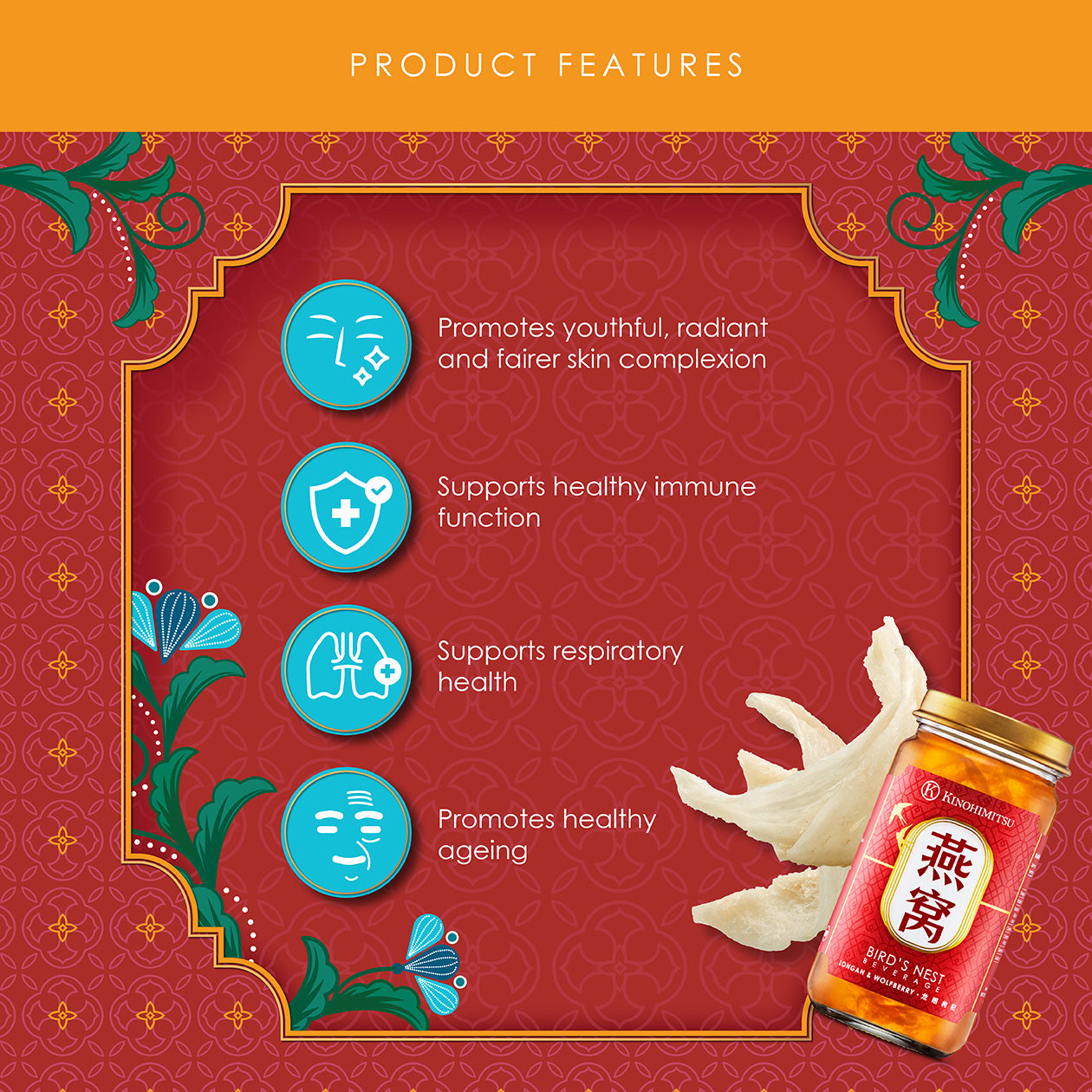 Kinohimitsu Bird’s Nest Beverage with Longan & Wolfberry combines genuine deluxe quality Bird’s Nest with Longan and Wolfberry, carefully prepared to retain their nutrients. The combination of Traditional Chinese Medicine knowledge induces body warming effect and provides nourishment to your “Yin” while enhancing body overall well-being.