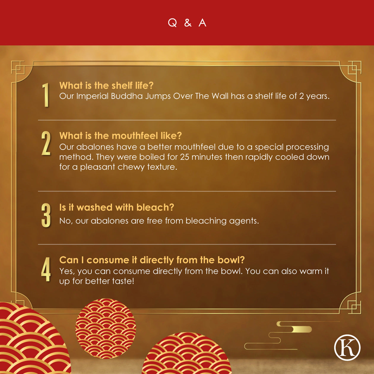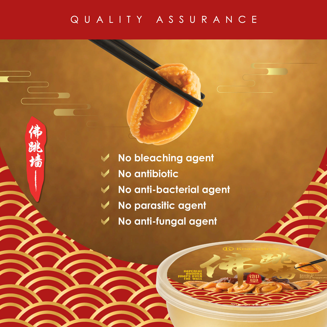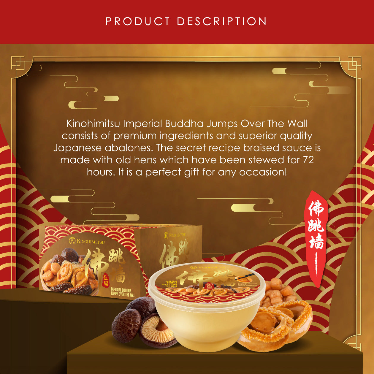 Kinohimitsu Imperial Buddha Jumps Over the Wall consists of premium ingredients and superior quality Japanese abalones. The secret recipe braised source is made with old hens which have been stewed for 72 hours. It is a perfect gift for any occasion!