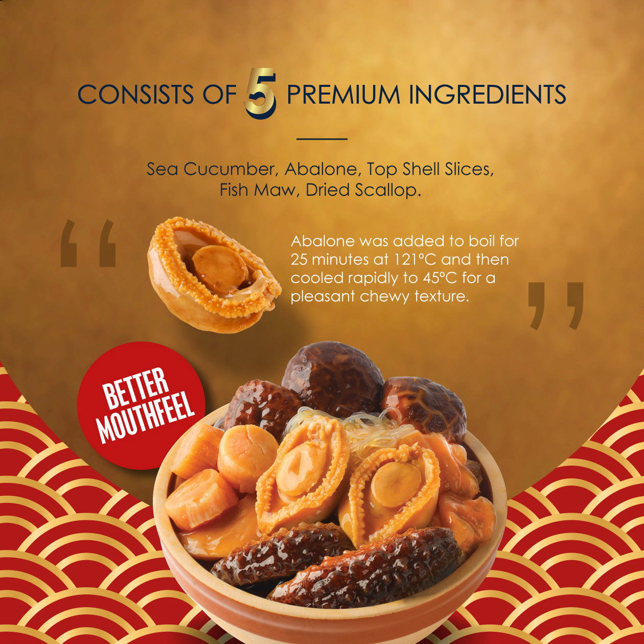 ▪ Consists of 5 premium ingredients: Sea Cucumber, Abalone, Top Shell Slices, Fish Maw, Dried Scallop.