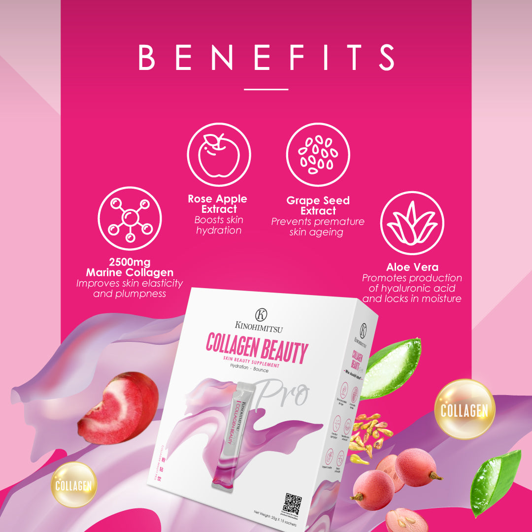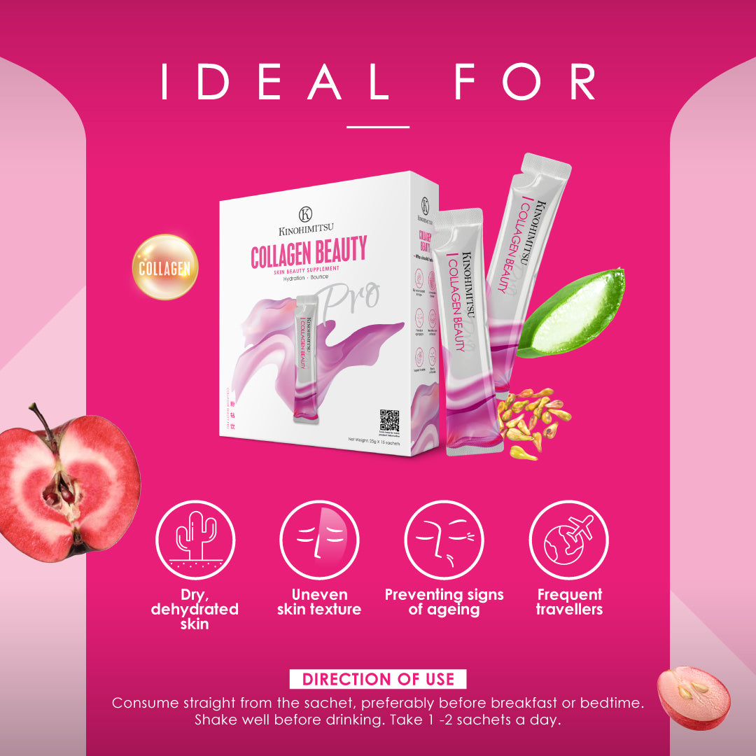 Toodles to dry, dull, and ageing skin! Kinohimitsu Collagen Beauty Pro hydrates, firms, and revitalises your skin with a potent blend of Marine Collagen and Rose Apple Extract in every convenient sachet.