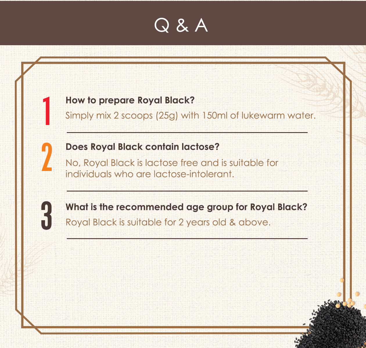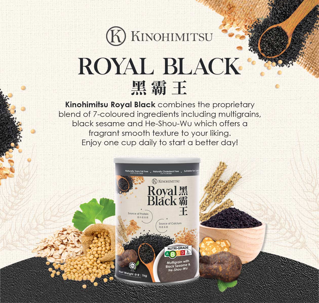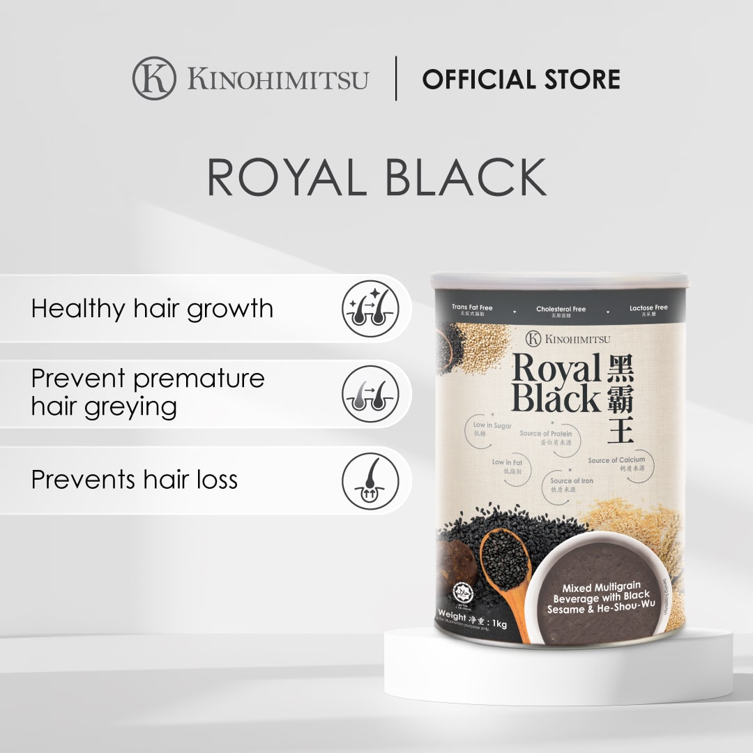 Royal Black is a nourishing multigrain beverage that promotes hair growth, restores natural black hair color, and supports scalp health, liver function, and blood circulation. Made with He-Shou-Wu and black sesame, it delivers a smooth, fragrant sesame flavor to enjoy hot or cold.