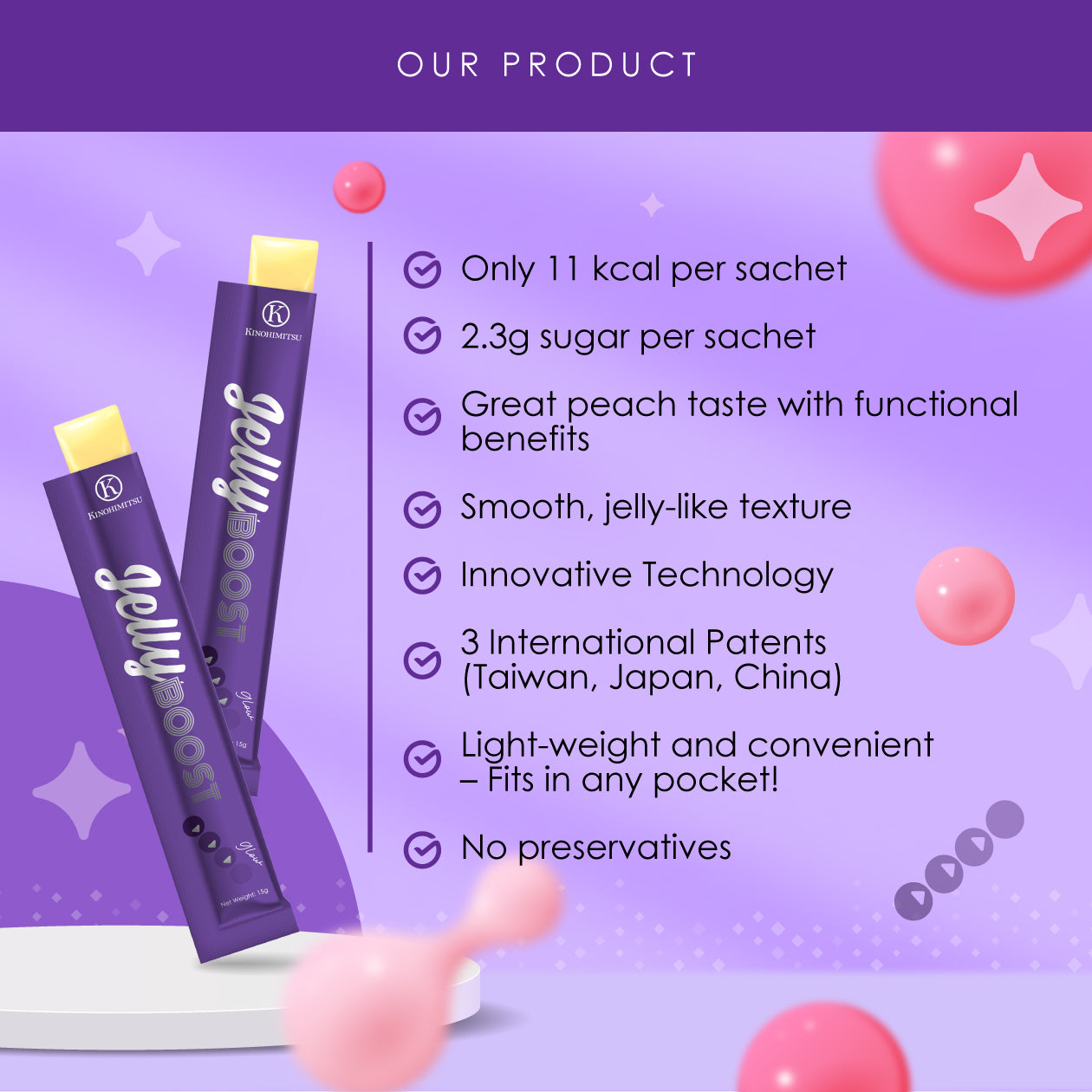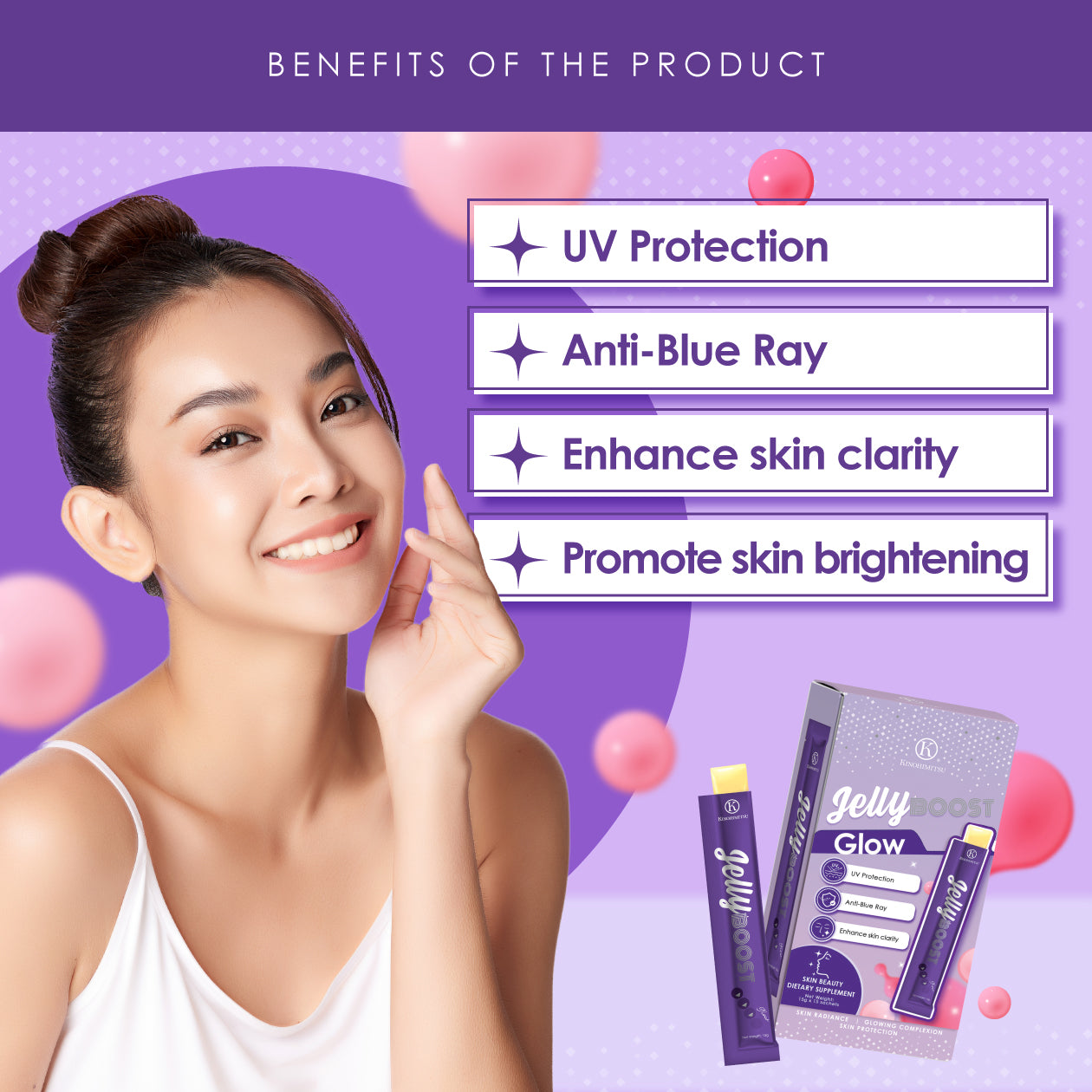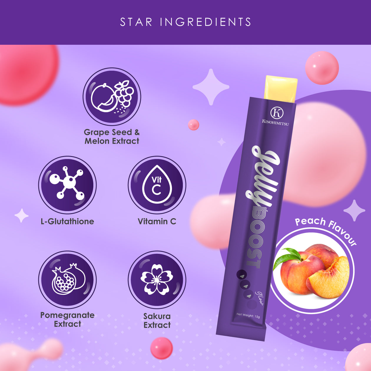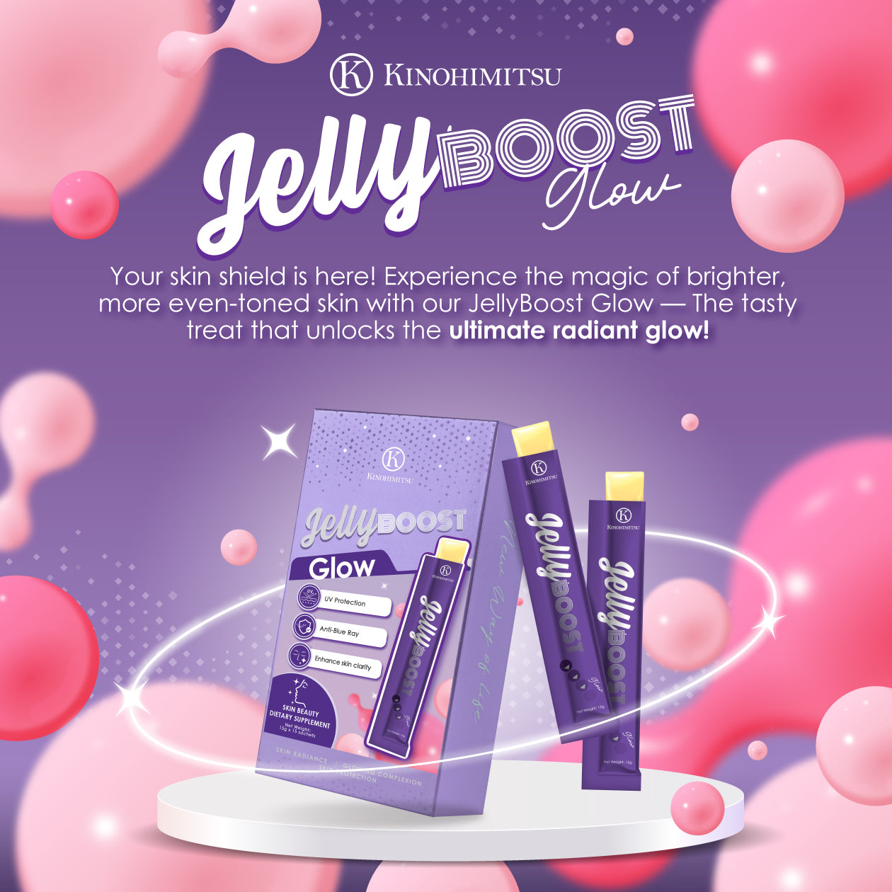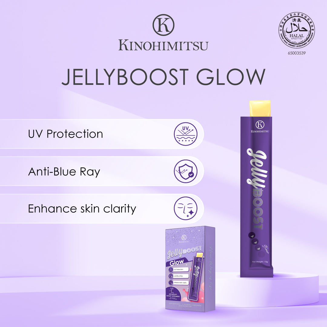 Kinohimitsu JellyBoost Glow is your pocket glow-up essential. Packed with L-Glutathione, Vitamin C, and pomegranate extract, it brightens, protects, evens dark spots, and leaves your skin radiant.